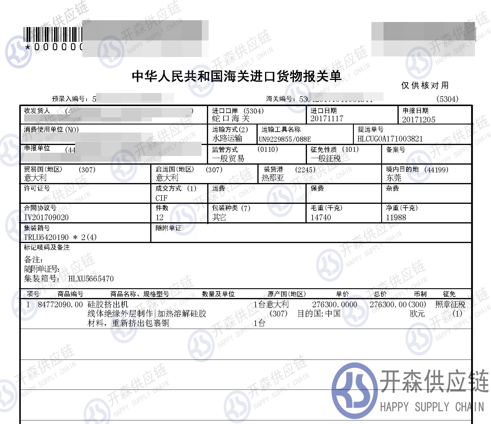 從意大利進(jìn)口一臺(tái)硅膠擠出機(jī)到深圳蛇口碼頭,我司提供門到門機(jī)械設(shè)備進(jìn)口一站式清關(guān)服務(wù),開(kāi)森擁有十余年二手機(jī)械設(shè)備進(jìn)口清關(guān)經(jīng)驗(yàn)及案例,為客戶提供量身制作的進(jìn)口方案,讓客戶進(jìn)口省時(shí)省心省成本。